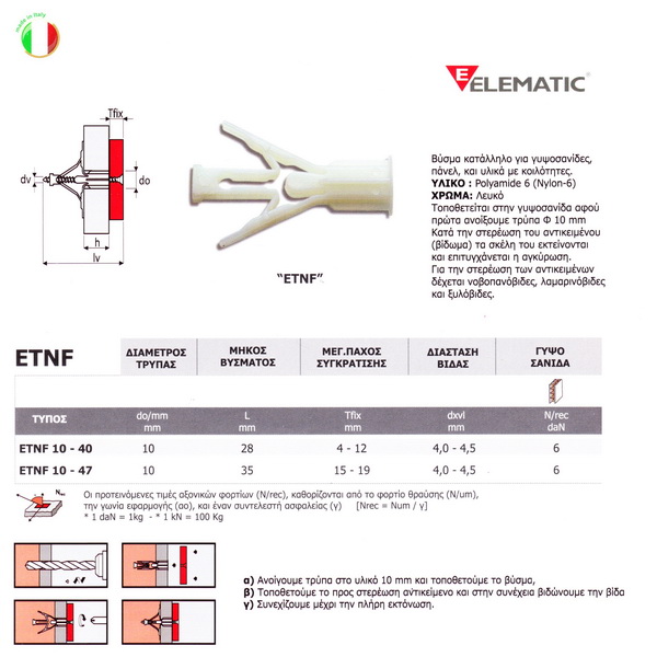 Τοποθετείται στην γυψοσανίδα αφού πρώτα ανοίξουμε τρύπα Φ 10 mm. Κατά τη στερέωση του αντικειμένου (βίδωμα) τα σκέλη του εκτείνονται και επιταχύνεται η αγκύρωση. Για την στερέωση τοων αντικειμένων δέχεται νοβοπανόβιδες, λαμαρινόβιδες, και ξυλόβιδες.