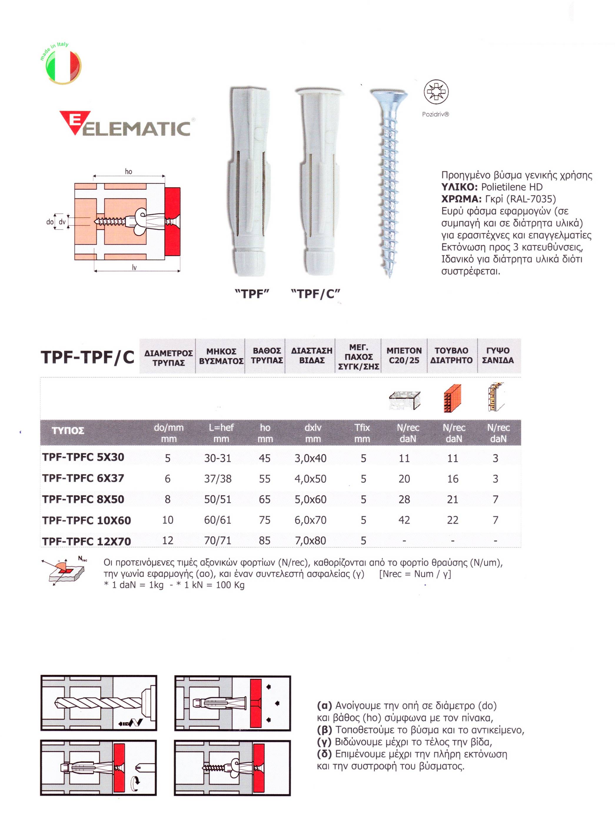 Ούπατ  TPF/C με κεφάλι από ”NYLON”. Ευρύ φάσμα εφαρμογών (σε συμπαγή και σε διάτρητα υλικά) για ερασιτέχνες και επαγγελματίες. Εκτόνωση προς 3 κατευθύνσεις. Ιδανικό για διάτρητα υλικά διότι συστρέφεται. Υλικά εφαρμογής  : Γυψοσανίδα – Τούβλο – Ξύλο κ.λ.π.